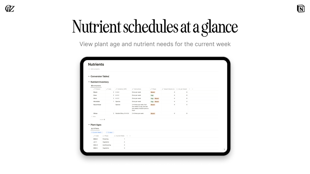 I eventually wanted to organize better and dial in my process, so I looked for options to help me track and manage everything about my grow in one place. I was already using Notion as a project management tool and started building for myself what would eventually become plantOS. I kept adding more features and more complex formulas, and found it really helpful, so I want to make it available to others who might also be facing the same challenges.